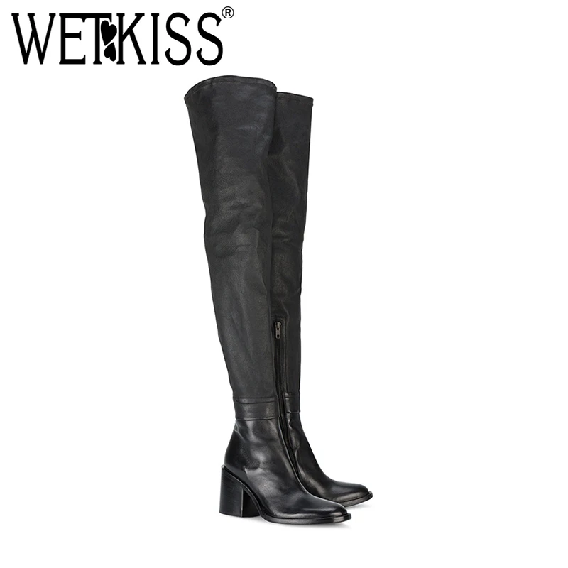 Us 68 8 45 Off Wetkiss 2018 Terbaru Di Atas Lutut Boot Wanita Fashion Kulit Atas Keren Square Sepatu Hak Tinggi Musim Dingin Boot Wanita Sepatu Bot - Download