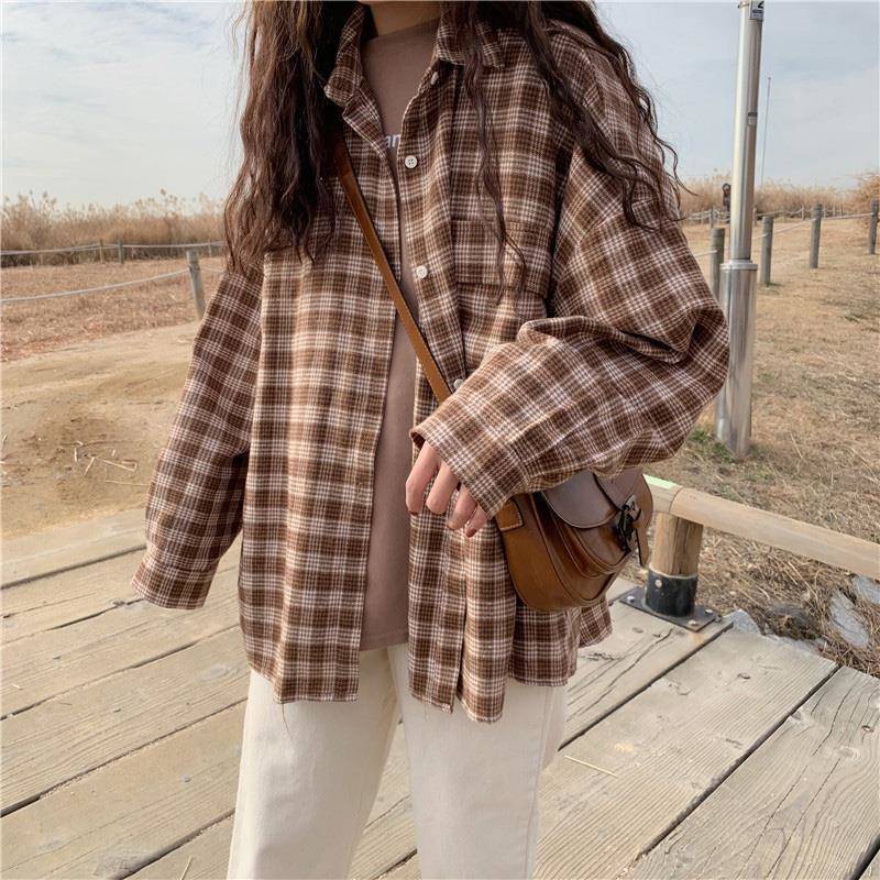 Kemeja Wanita Lengan Panjang Model Retro Longgar Versi Korea Motif Print Kotak Kotak Untuk Musim Gug - Download